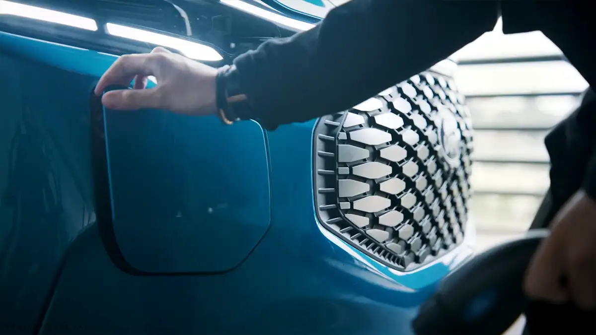 مع شبكة تهوية مُرسّعة جديدة، يمر أعلاها شريط مُضيء، يصل ما بين المصابيح الأمامية الأنيقة، والتي ستعمل بالكامل بتقنية إضاءة LED، مع مصد أمامي منحوت بدقة، ويحتوى على مدخل شحن السيارة الرئيسي.