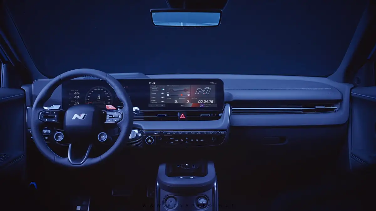 داخل مقصورة ايونيك 5 N ذات الطابع الداكن، أضافت هيونداي زوجًا من المقاعد الرياضية مع مساند رأس مدمجة، ودواسات رياضية من الألومنيوم، وحواف جلدية مع درزات بيضاء، ومجموعة من شعارات «N» في كل مكان تنظر إليه.