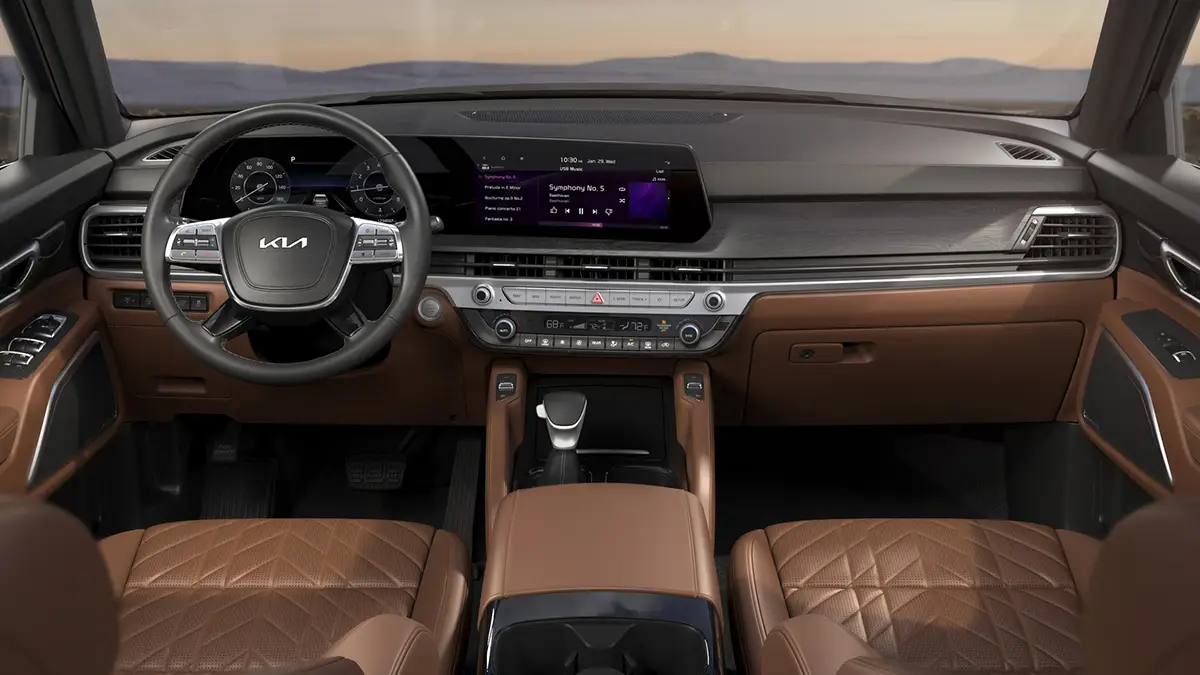 داخليًا تبنت كيا تيلورايد 2023 الجديدة نمط الشاشتين المُثبتتان عرضيًا، والتي تتكوّن من شاشتين ملتصقتين قياس كلًا منهما 12,3 بوصة، أحدهما تعمل كلوحة عدادات رقمية تفاعلية، والثانية ستتحكم في وظائف النظام المعلوماتي الترفيهي للسيارة.